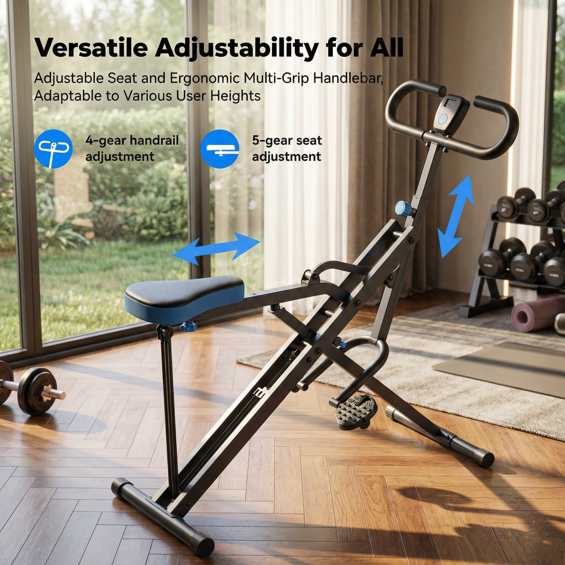 Achieve perfect form with 4-level handlebar and 5-level seat adjustments. This ergonomic, multi-grip trainer ensures a customized, full-body workout for users of all heights and fitness levels.